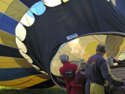 Mit dem Gasbrenner wird Heißluft in den Ballon geblasen |