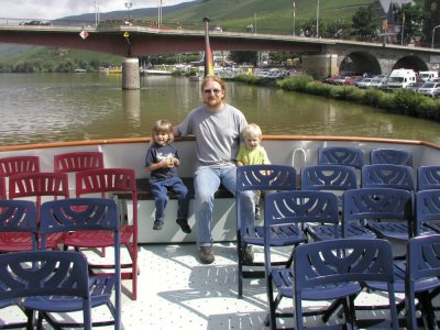 | 09.08. Heute sind Mama, Falk, Merlin und ich kurzfristig übers Wochenende nach Bernkastel-Kues gefahren. Eine Unterkunft in Bernkastel-Wehlen haben wir glücklicherweise noch ergattern können. Eigentlich sind wir ausgerechnet dort hin weil in Bernkastel Ballonfahrer - Meeting war und Mama und Falk uns Kindern mal diese Heißluftballons aus der Nähe zeigen wollten. Leider war heute das Wetter aber nicht so rosig und deshalb konnten die Ballons nicht fahren. So haben wir einen schönen Bummel durch die Gassen der Altstadt gemacht und uns so die Zeit verduldet. 10.08. Der Tag ist total schön gewesen. Sonne, Sonne, Sonne. So konnten wir mit dem Schiff eine Rundfahrt auf der Mosel machen und Merlin und ich fanden es richtig toll. Abends um 18:00 Uhr sollten wieder Ballons starten, wir sind da auch hingefahren, aber bis dahin hatten sich schon wieder die Regenwolken breit gemacht und es fing an zu nieseln. War also wieder nix mit Ballons, dafür ein undefinierbares Schnulzen-Getütel aus irgendwelchen Lautsprechern und Tanz im Festzelt. Das wollten sich unsere Eltern dann doch nicht antun. Eigentlich wäre um halb elf noch ein Höhenfeuerwerk gewesen, aber da Merlin und ich ziemlich müde und geschlaucht waren sind wir dann doch lieber wieder in unser Domizil gefahren und haben uns in die Nester gelegt und geschlafen. War ein langer Tag. |