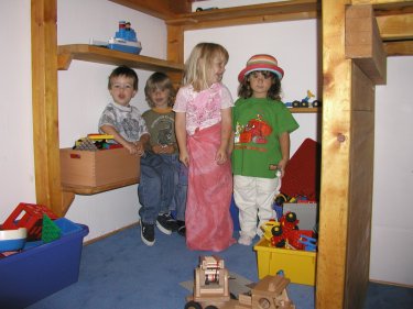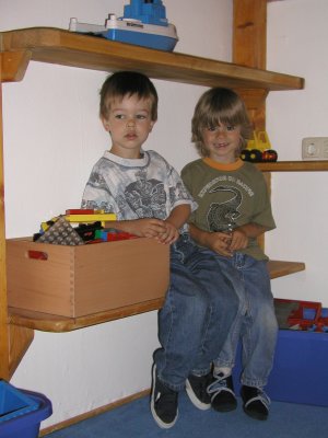 05.08. Mein erster Tag im Kindergarten. Argwöhnisch hab ich erst mal die ganzen Kinder beobachtet. In diesem Tumult soll ich jetzt jeden Vormittag verbringen? Na ja, Mama ist eine ganze Weile mit Merlin bei mir geblieben und ich konnte mich erst mal in aller Ruhe umgucken. Da ist ein Junge, der scheint ganz nett zu sein. Marco heißt er und ist ein paar wenige Monate jünger als ich. Außerdem sind da noch zwei Jungs die ich bereits aus der Turngruppe kenne: Kevin und sein großer Bruder Patrick. Ich fühle mich recht wohl in meiner "Delphin" - Gruppe. Das Zimmer ist ganz toll hergerichtet, mit viel Holz auf mehrere Etagen gestaltet. Oben sind die ganzen Spielsachen wie Lego, Autos, Kinderküche, Kuschelecke und so, und unten sind die Bastel- und Maltische und nochmals eine kleine Kuschelnische mit vieeelen Büchern. In einer versteckten Ecke steht eine Kindercouch und dort ist auch ein Kassettenrecorder, wo man mal Musik hören kann. Außerdem haben wir einen Kaufladen und eine richtige kleine Werkstatt, mit richtigem Werkzeug und alten, kaputten Haushaltsgeräten die es zu reparieren gilt. Der Außenbereich ist auch ganz toll angelegt, mit einem riesigen Sandkasten, einer Holzeisenbahn, einer ganz tollen Schaukel auf die wir zu acht passen, ein Garten mit Beeten, wo wir Gemüse und Erdbeeren pflanzen können, einen mit Rasen bepflanzten Tunnel (Kanalrohr) zum durchkrabbeln und eine schöne, kreisförmig angelegte Sitzbank, auf der wir mit allen drei Gruppen Platz haben.