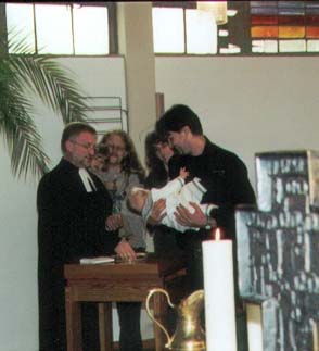 Mai 2001 Am 6.5. wurde ich getauft. Alle dachten, ich würde in der Kirche losplärren, wenn ich das Wasser über den Kopf bekomme, weil ich so wasserscheu bin. Ich hab sie aber eines Besseren belehrt und gezeigt, dass ich auch mal ganz brav sein kann. Den ganzen Tag über hab ich kaum einen Mucks von mir gegeben, war richtig lieb und hab viel geschlafen während die anderen fröhlich dieses grosse Ereignis gefeiert haben. Mein Pate, Henning, war ganz stolz. Natürlich war auch er derjenige, der mich über das Taufbecken heben durfte und er hat das richtig gut gemacht. |