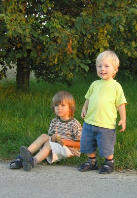 05.08. Mein erster Tag im Kindergarten. Argwöhnisch hab ich erst mal die ganzen Kinder beobachtet. In diesem Tumult soll ich jetzt jeden Vormittag verbringen? Na ja, Mama ist eine ganze Weile mit Merlin bei mir geblieben und ich konnte mich erst mal in aller Ruhe umgucken. Da ist ein Junge, der scheint ganz nett zu sein. Marco heißt er und ist ein paar wenige Monate jünger als ich. Außerdem sind da noch zwei Jungs die ich bereits aus der Turngruppe kenne: Kevin und sein großer Bruder Patrick. Ich fühle mich recht wohl in meiner "Delphin" - Gruppe. Das Zimmer ist ganz toll hergerichtet, mit viel Holz auf mehrere Etagen gestaltet. Oben sind die ganzen Spielsachen wie Lego, Autos, Kinderküche, Kuschelecke und so, und unten sind die Bastel- und Maltische und nochmals eine kleine Kuschelnische mit vieeelen Büchern. In einer versteckten Ecke steht eine Kindercouch und dort ist auch ein Kassettenrecorder, wo man mal Musik hören kann. Außerdem haben wir einen Kaufladen und eine richtige kleine Werkstatt, mit richtigem Werkzeug und alten, kaputten Haushaltsgeräten die es zu reparieren gilt. Der Außenbereich ist auch ganz toll angelegt, mit einem riesigen Sandkasten, einer Holzeisenbahn, einer ganz tollen Schaukel auf die wir zu acht passen, ein Garten mit Beeten, wo wir Gemüse und Erdbeeren pflanzen können, einen mit Rasen bepflanzten Tunnel (Kanalrohr) zum durchkrabbeln und eine schöne, kreisförmig angelegte Sitzbank, auf der wir mit allen drei Gruppen Platz haben.