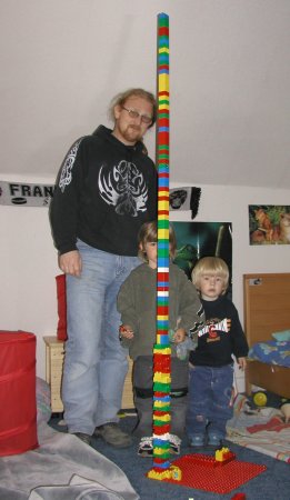 Mit Merlin zusammen baue ich sehr gerne mit unseren Legosteinen. Wir haben mal mit Papa zusammen einen ganz großen Turm gebaut, der war fast doppelt so groß als ich. Mama musste dann natürlich gleich ein Foto machen. Manchmal holen wir uns auch viele viele Decken und Kissen bei und bauen uns einen Kuschelturm. Da lassen wir uns dann drauf fallen und kuscheln miteinander. Macht Laune ohne Ende! Mama schimpft dann nur jedes Mal wenn wir die Sachen nicht wieder an ihren Platz zurückräumen. |
