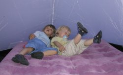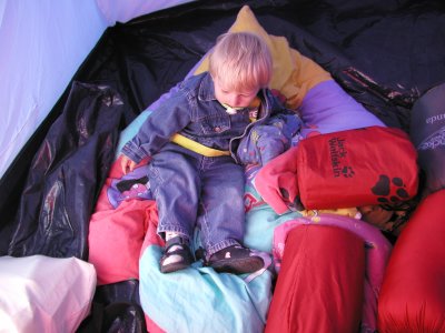 14.06. Also... meine erste Nacht im Zelt mit Daniel war ziemlich aufregend. Zuerst haben wir mal die Luftmatratze aufgepumpt und Daniel durfte dabei helfen. Dann durften wir noch ein wenig auf der Matratze hopsen und rumkullern, was einen Megaspass gemacht hat. Purzelbäume schlagen auf so weichem Untergrund macht richtig Laune, vor allem weil man noch zigmal nachwippt. So sind wir wieder richtig wach geworden *lach* obwohl wir eigentlich schon todmüde waren...... Nun, irgendwann mussten wir dann rein um die Schlafanzüge anzuziehen, uns zu waschen und die Zähne zu putzen. Das war dann schon ne ziemliche Aktion für unsere Grossen. Als wir wieder im Zelt waren hab ich nicht so recht verstanden dass ich nun hier schlafen sollte. Im Schlafsack hielt mich nichts, also bekam ich meine Schlafdecke gebracht. Aber auch das konnte mich nicht überzeugen dass ich eigentlich hundemüde war. Naja, da hat Papa noch ein wenig mit mir geschmust und irgendwann, gegen halb elf, ist er dann entnervt aus dem Zelt rausgegangen und hat überlegt, ob ich nicht doch besser in meinem Bett schlafen sollte. Mama hat sich da mal ganz rausgehalten in der Hoffnung "Paps macht das schon!". Ich fing an zu weinen und rief nach meinem Papa, aber da meinte Dani neben mir "komm Merlin, leg Dich jetzt hin und schlaf! Ich bin doch da". Und da konnte ich auf einmal doch schlafen, eng an Daniel gekuschelt, und bin erst wieder kurz nach halb acht am nächsten Morgen aufgewacht. |