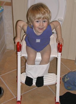 März 2003 Wir sind gerade beim Sauberkeitstraining und das klappt recht gut. Ich sage immer wenn ich mal muss und dann darf ich auf die "große" Toilette gehen. Mit der Treppe macht das richtig Spaß und ich bin ja schon sooo ein Großer. Abends krieg ich dann noch eine Pampie an, aber es ist nur eine Frage der Zeit bis das Thema auch erledigt ist. Es ist ja viel schöner, wenn man mehr Bewegungsfreiheit hat und wenn ich irgendwann gar keine Windeln mehr brauch, dann darf ich mit Daniel ins "Große Kinder -Turnen". Beim Babyturnen finde ich es nämlich inzwischen ziemlich langweilig. Da sind ja lauter Kleine und ich bin doch schon so ein großer Junge. Das ist für mich Anreiz genug um endlich sauber zu werden.