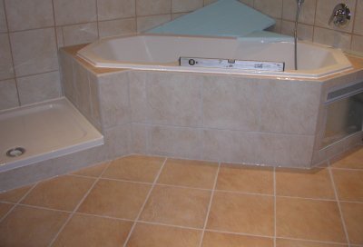 | 17.04.2002 Jetzt haben wir es auch endlich geschafft, die Ecke an der Badewanne zu verschliessen und heute habe ich die Fliesen dafür zurechtgeschnitten. Wenn wir es bis zum Wochenende fertigbringen alle restlichen Fliesen zu verkleben und zu verfugen, dann können in der kommenden Woche die noch fehlenden Armaturen in der Dusche angebracht werden und die Toilette kann montiert werden. Dann wären wir auch mit der Firma XYZ *lach* fertig. |