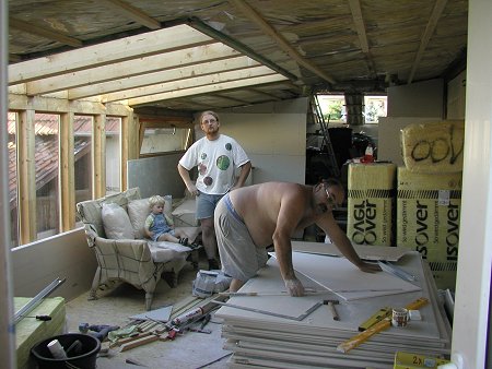 19.07. Die eine Wand im Wohnraum oben haben Günther und ich heute komplett isoliert und mit Rigips verkleidet. Es ist schon noch eine Menge zu tun dort unter dem Dach und bei der momentan herrschenden Hitze ist es nicht unbedingt ein Zuckerschlecken da zu arbeiten, aber es geht voran.