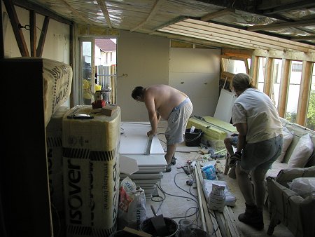 05.07. Inzwischen haben wir die Wände des Wintergartens komplett verkleidet, die Elektriker sind auch soweit fertig und es müssen nur noch die Abdeckungen für die Steckdosen aufgedrückt werden . Aber zuerst ist jetzt mal wieder der obere Bereich unseres Wohnzimmers dran, ehe wir mit dem Verputzen anfangen können.