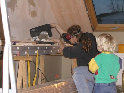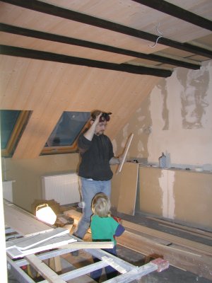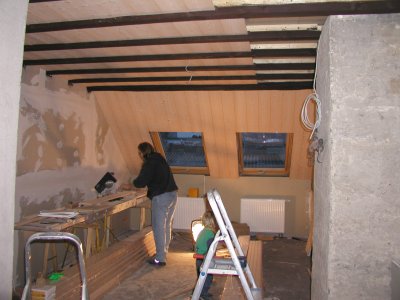 08.11.2003 Günther und ich haben heute mal die neue Tür für´s Wohnzimmer eingebaut und mit der Holzdecke unterm Dach angefangen. Das macht richtig Spaß, auch wenn es wegen der eingezogenen Balken etwas mehr Arbeit macht als es normalerweise der Fall wäre. Dafür wirkt die Decke aber später sicher auch schöner, und das ist uns die Mühe wert. Jedenfalls haben wir heute schon ein schönes Stück geschafft und ich kann auch unter der Woche weiter machen. Vielleicht sind wir dann bald soweit, dass wir die Wände verputzen können. Die Bodendielen liegen auch schon abrufbereit in der Holzhandlung.