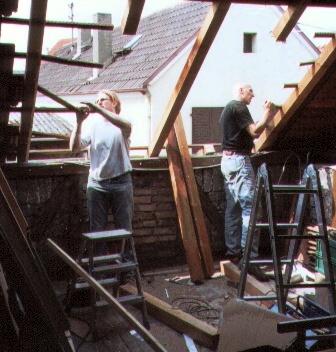 | 09.06.2001 Geschafft!!! Heute haben wir unsere zwei Dachfenster im neuen Wohnzimmer eingebaut. Vor allem hatten wir Glück mit dem Wetter denn die letzten Tage hat es nur geregnet. Es sieht richtig gut aus mit den zwei Fenstern. So, als wären sie schon immer da gewesen. Vor allem haben wir jetzt endlich mal genug Licht da oben unterm Dach um weiterarbeiten zu können. Nun müssen sie nur noch dicht sein. |