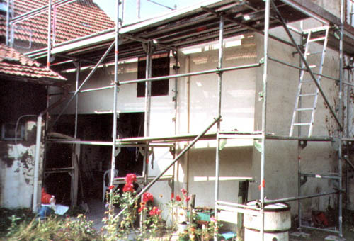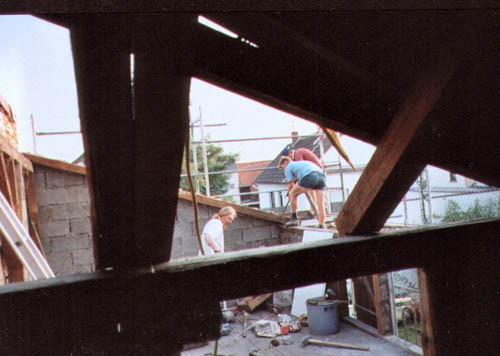 24.08.2001 Endlich konnten wir mit dem Bau des Wintergartens beginnen. Heute haben Reiner, unser Zimmermann, mein Vater und ich das Dach des Schuppens abgedeckt, die alten Sparren herausgerissen und die Wände zum Garten hin rausgeklopft, in deren Bereich später die Glaselemente eingebaut werden. Doro hat derweil ein wenig weitergemauert im Bad.